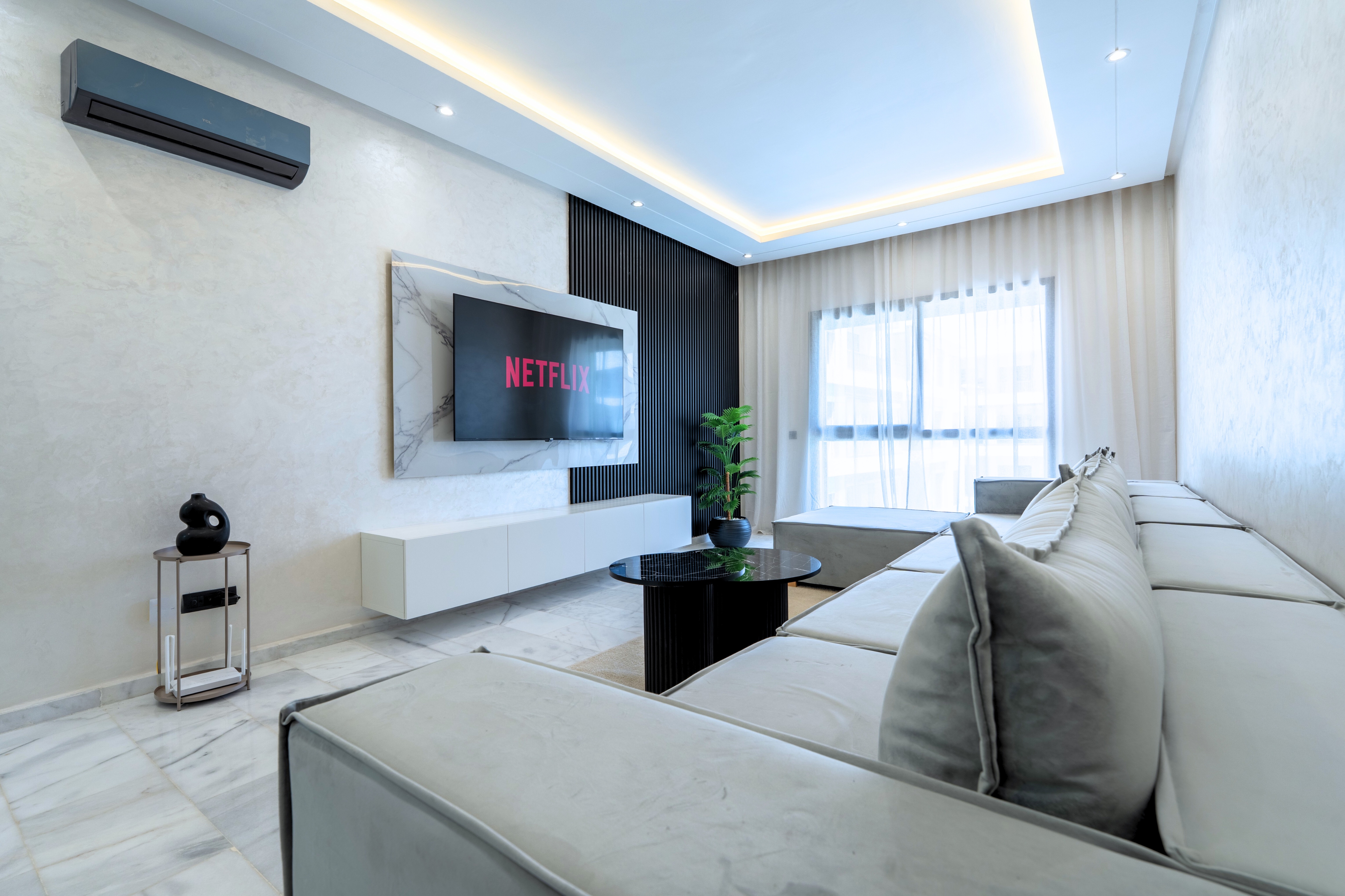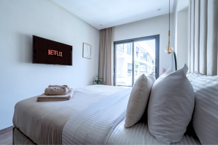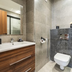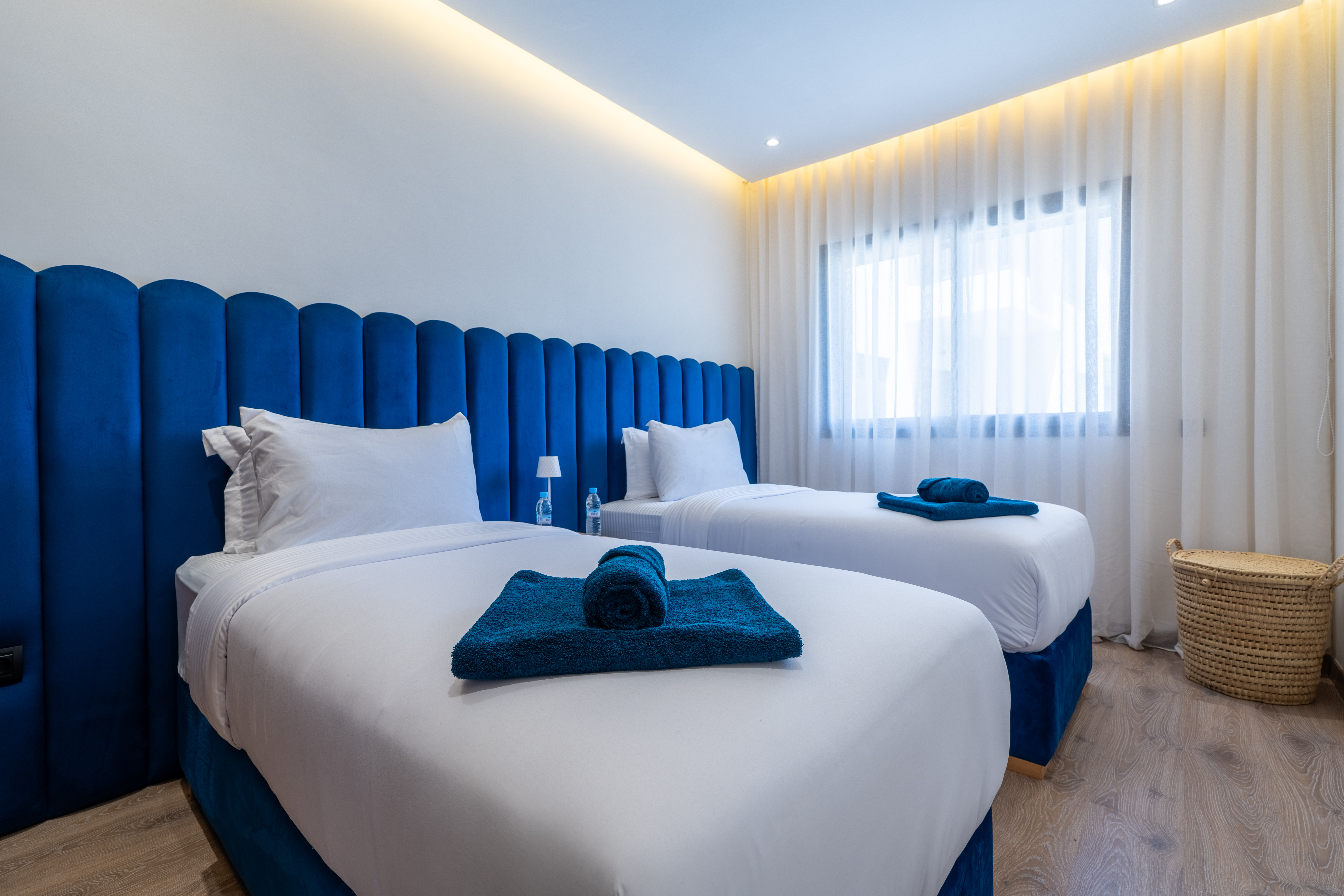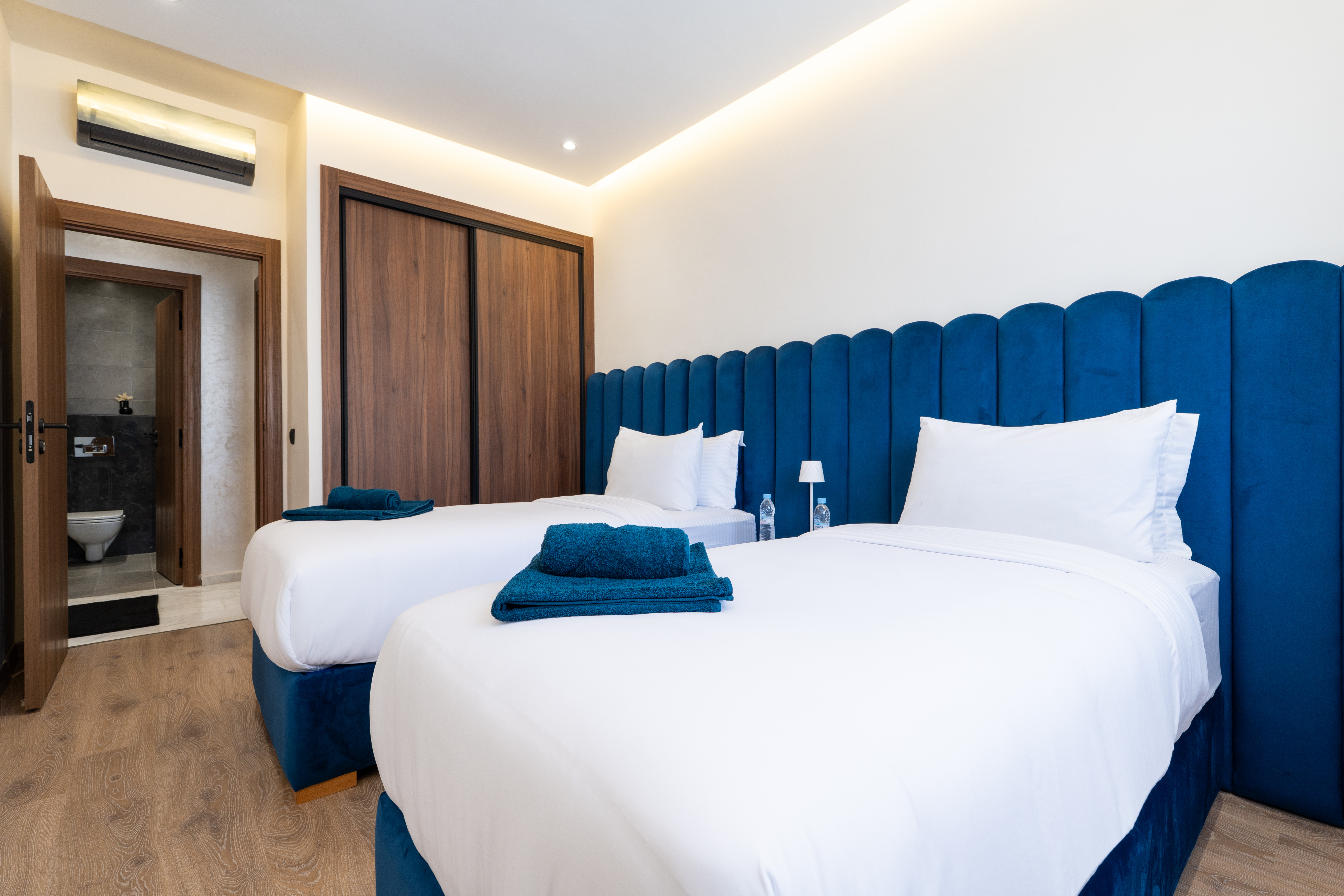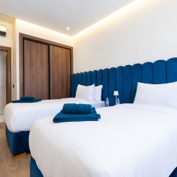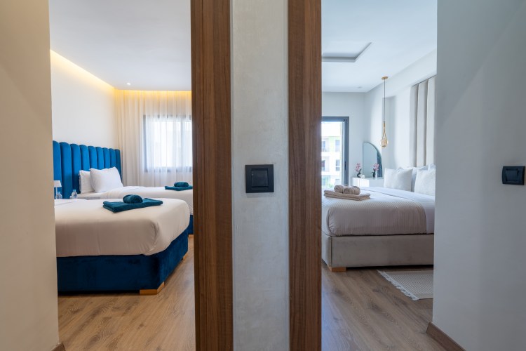 → Appartement moderne avec 2 chambres : une avec lit double, l’autre avec deux lits simples – parfait pour couples, amis ou famille.