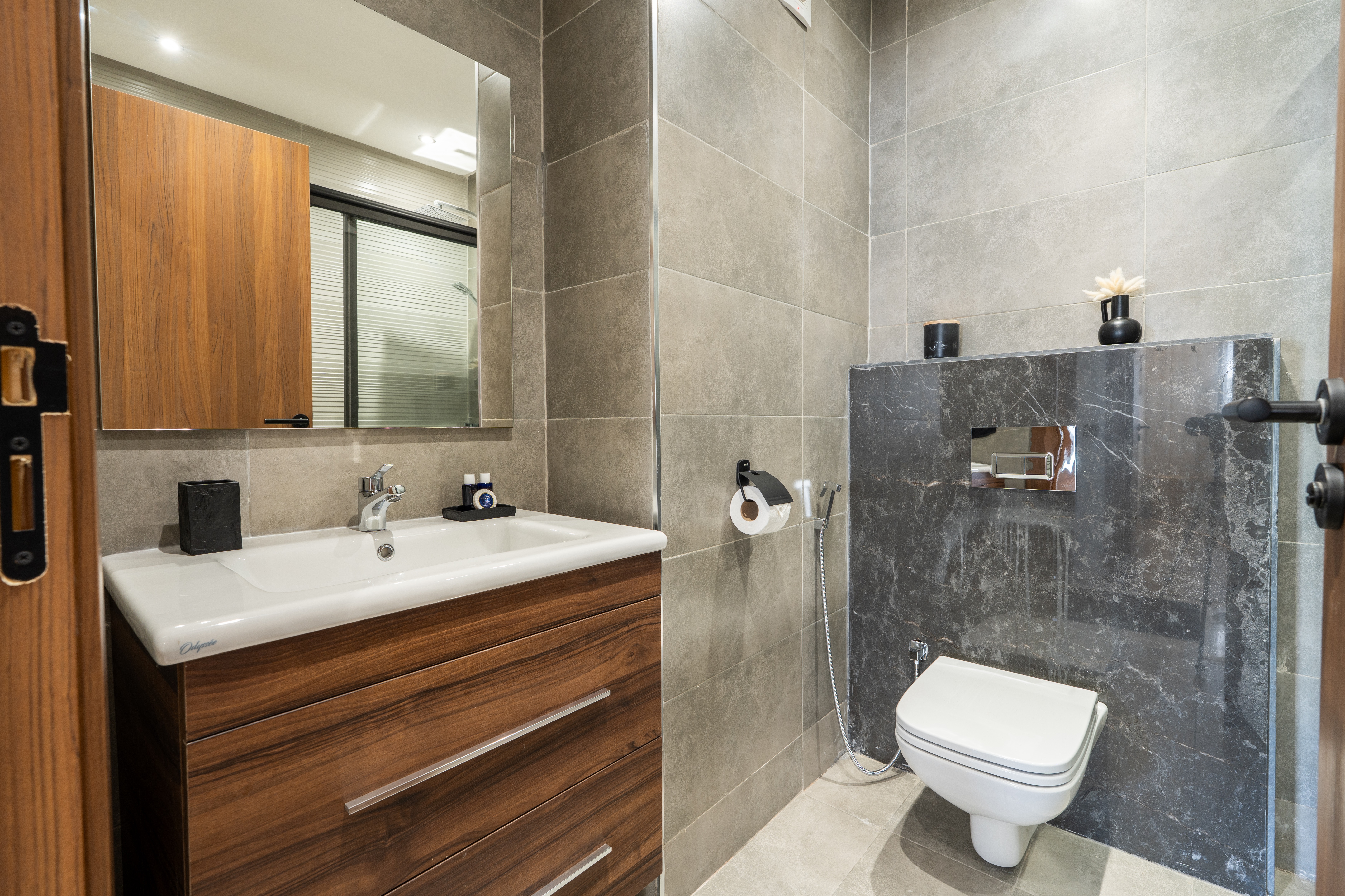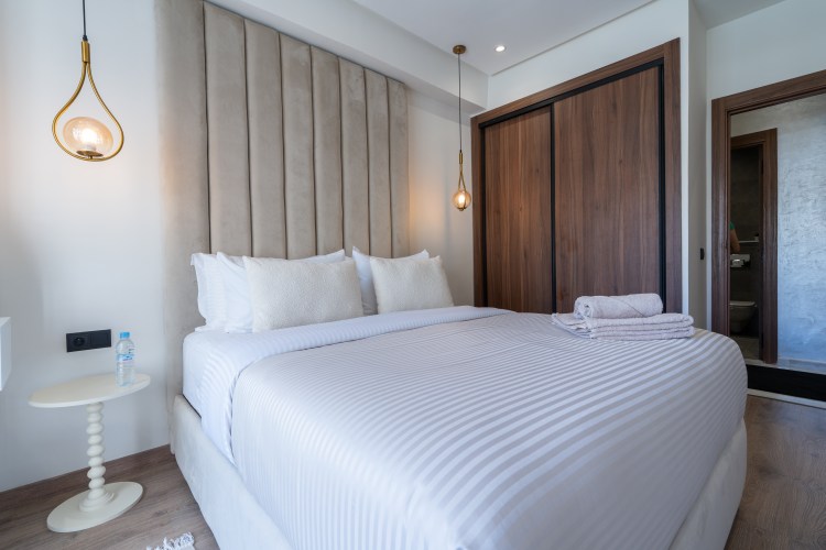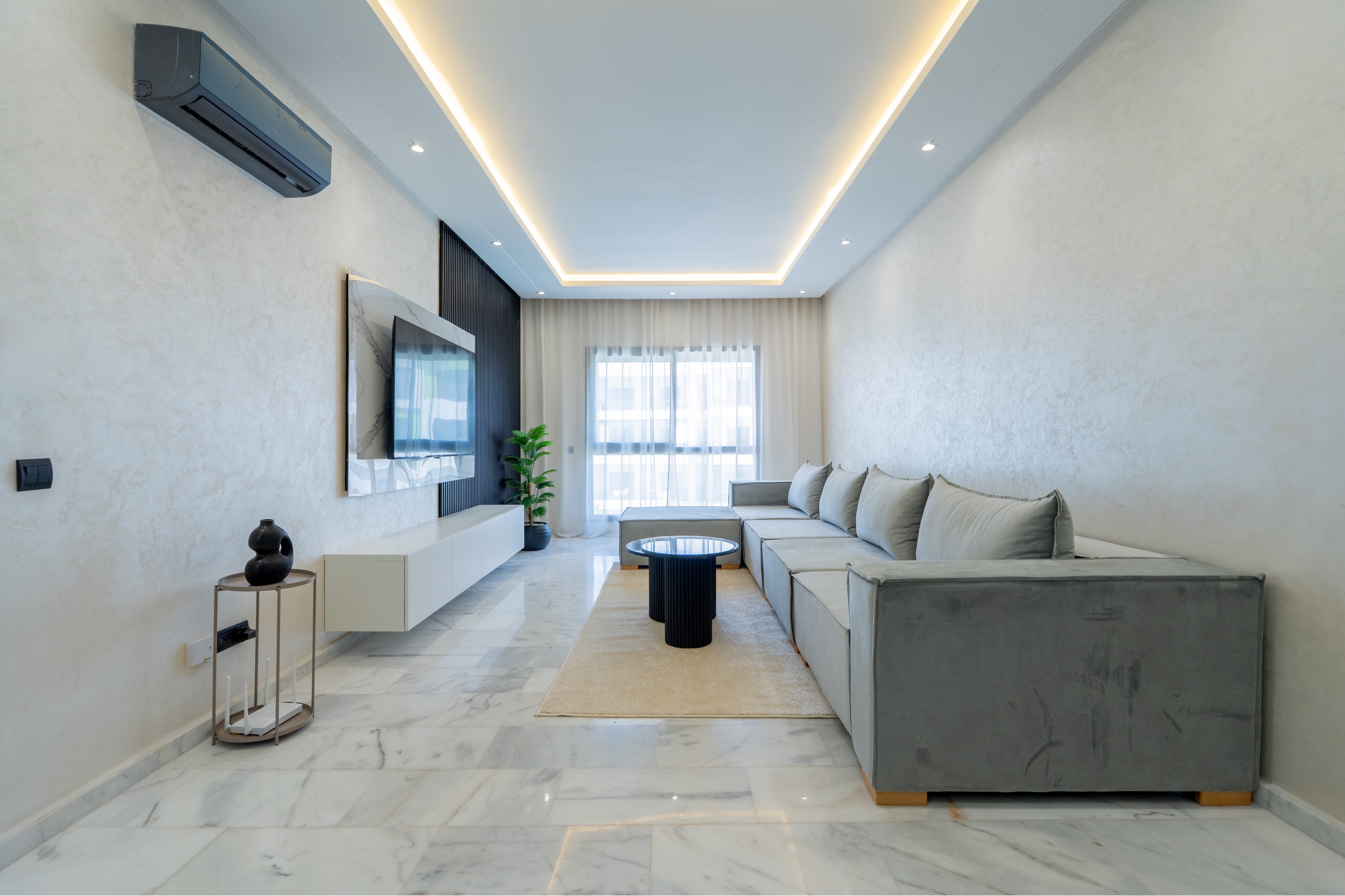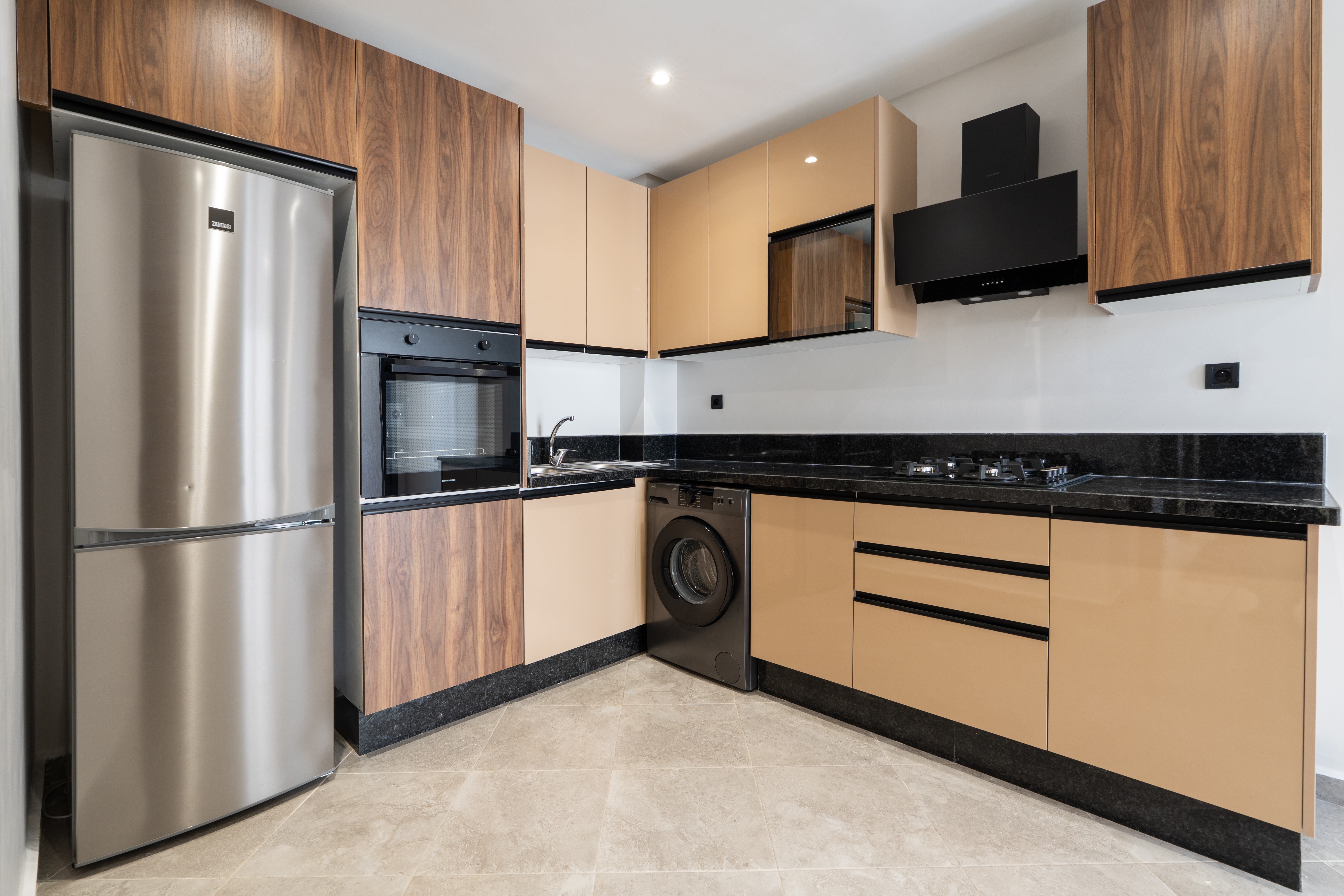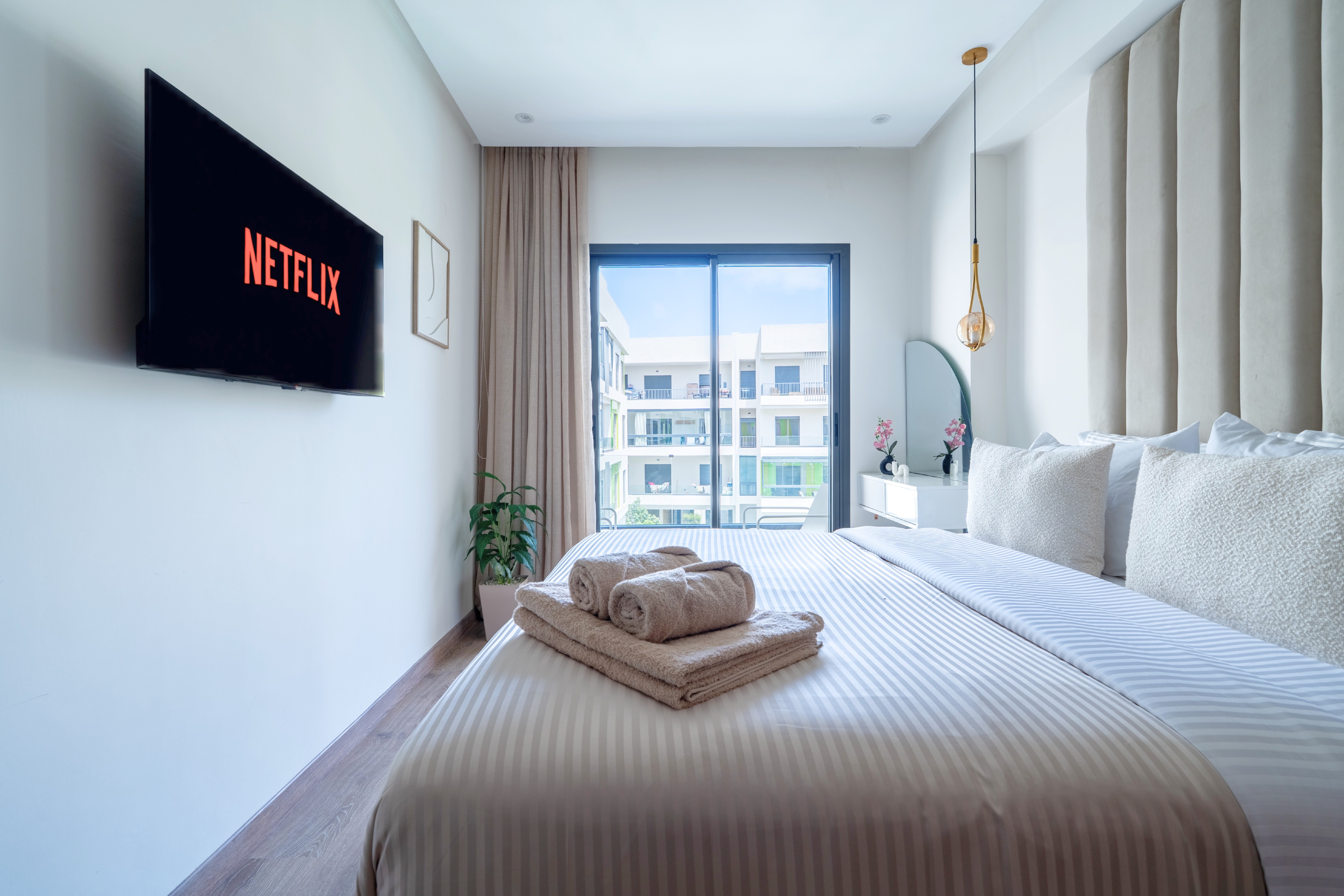 → Appartement moderne avec 2 chambres : une avec lit double, l’autre avec deux lits simples – parfait pour couples, amis ou famille.