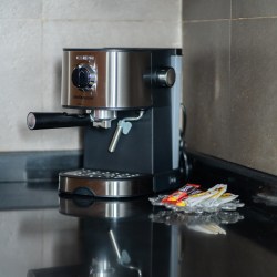 → Bouilloire, grille-pain, machine à café et un assortiment de thés et cafés pour bien commencer la journée.